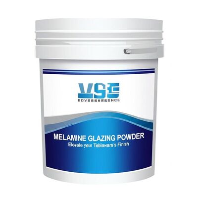 Melamine Glazing Powder is a pure melamine-formaldehyde resin that has been ground into a fine powder. Unlike the Melamine Molding Compound (MMC) used to form the product, the glazing powder contains no pulp, making it virtually transparent when cured. It is applied during the final stage of the molding cycle to achieve a superior surface finish.